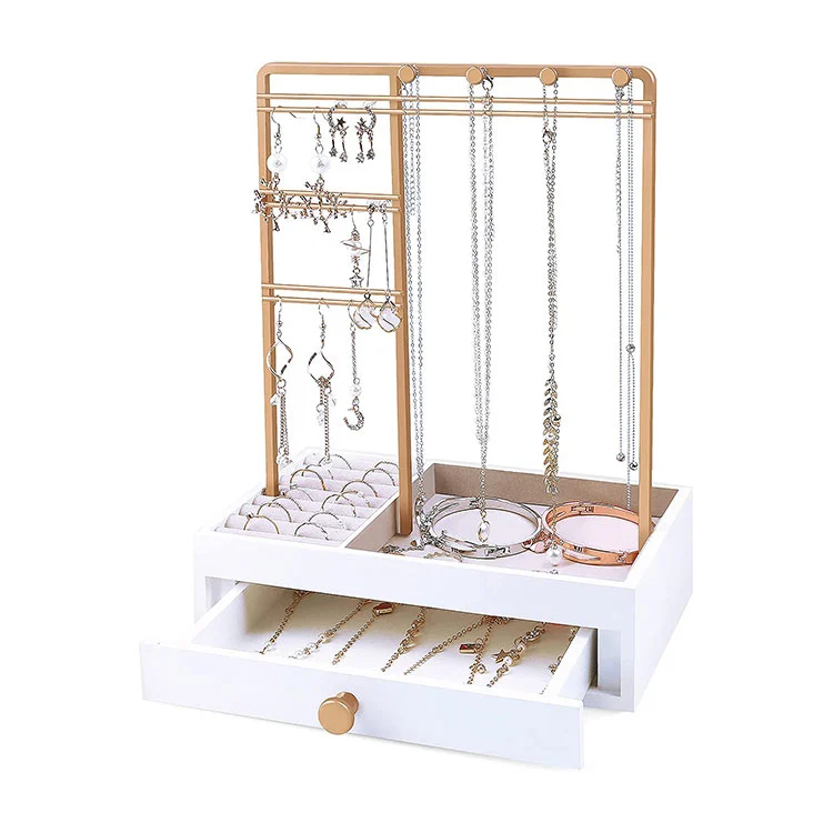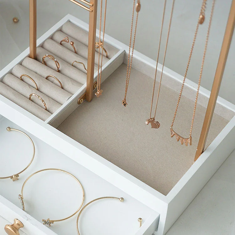 Övre lager öppet visningsområde: Gyllene metallram, lämplig för att hänga upp halsband, örhängen och armband. Det är lätt att se och kan nås efter behov.