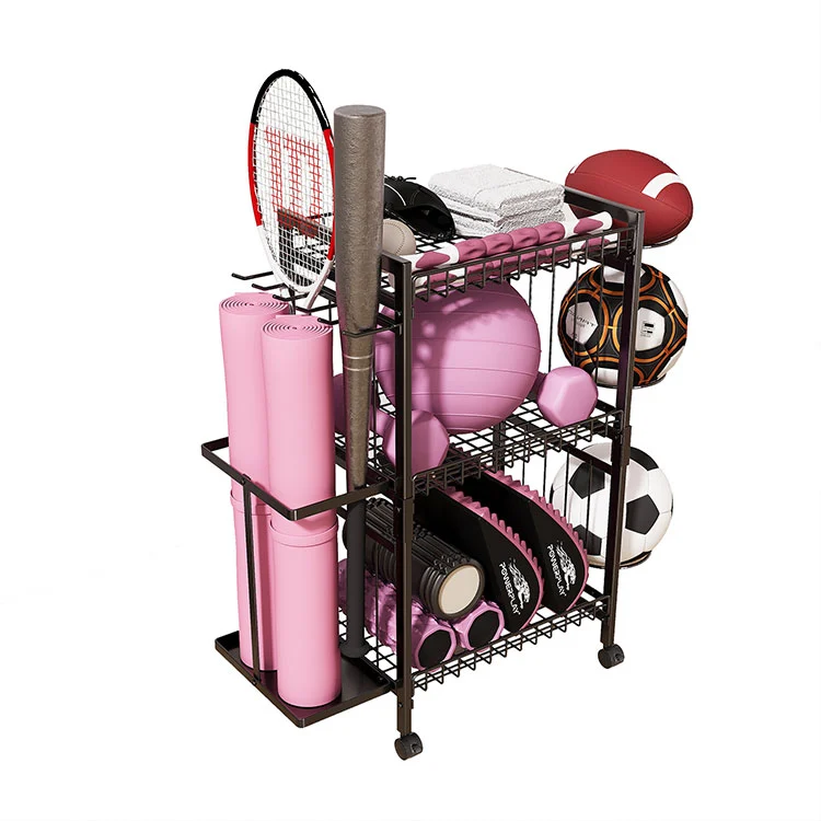 S: Detta golvstående förvaringsställ för yogamattor i metall är utrustat med 4 svängbara hjul med stor diameter. Även när den är fullastad med 100 kg kan en person lätt skjuta den. Tryckkraften på plan mark är liten, och kvinnliga användare kan också använda den.