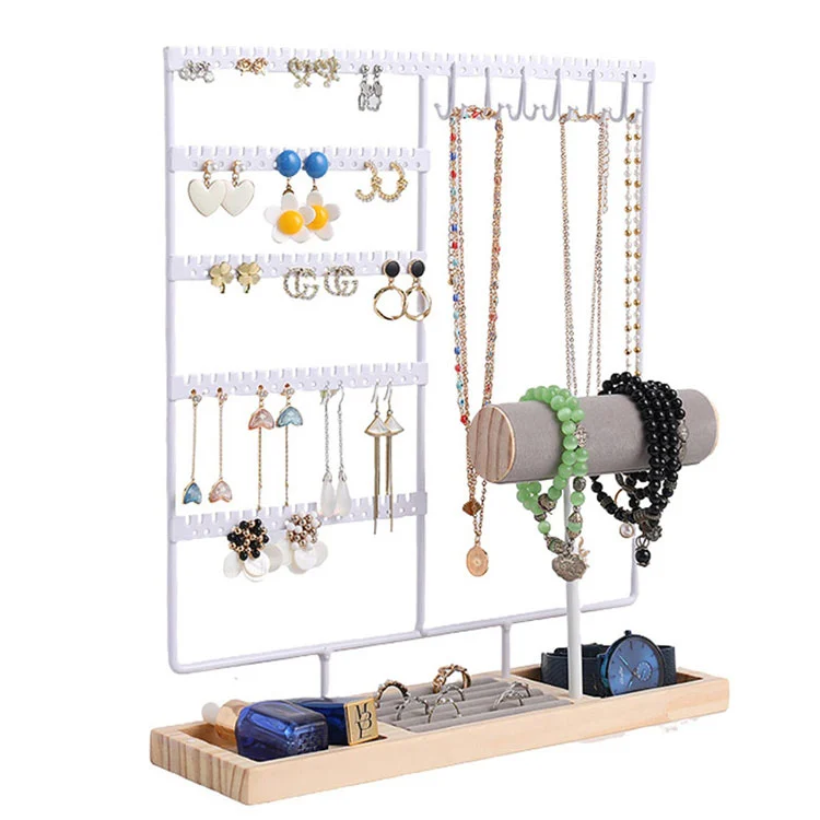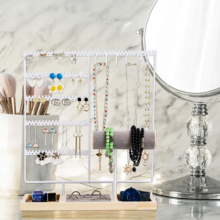 Samtidigt är denna vertikala smyckesarrangör med krokar gjord av en kombination av metall och trämaterial, med högkvalitativ och utsökt struktur. Den breddade basen gör att det är mindre benäget att välta. Med det kommer smycken inte att staplas upp kaotiskt eller vara svåra att hitta, och det undviker också problemet med att halsband trasslar sig och knyter sig.